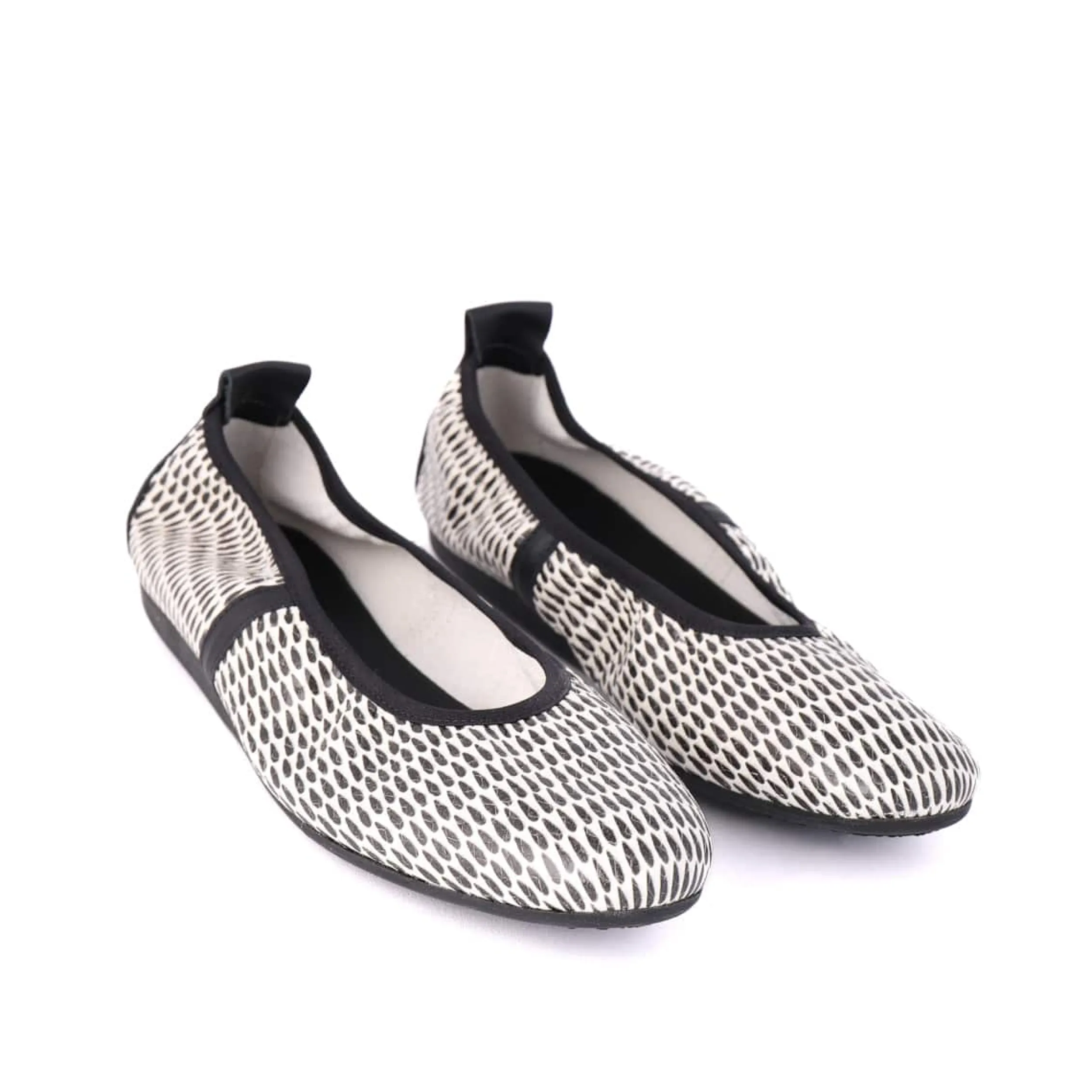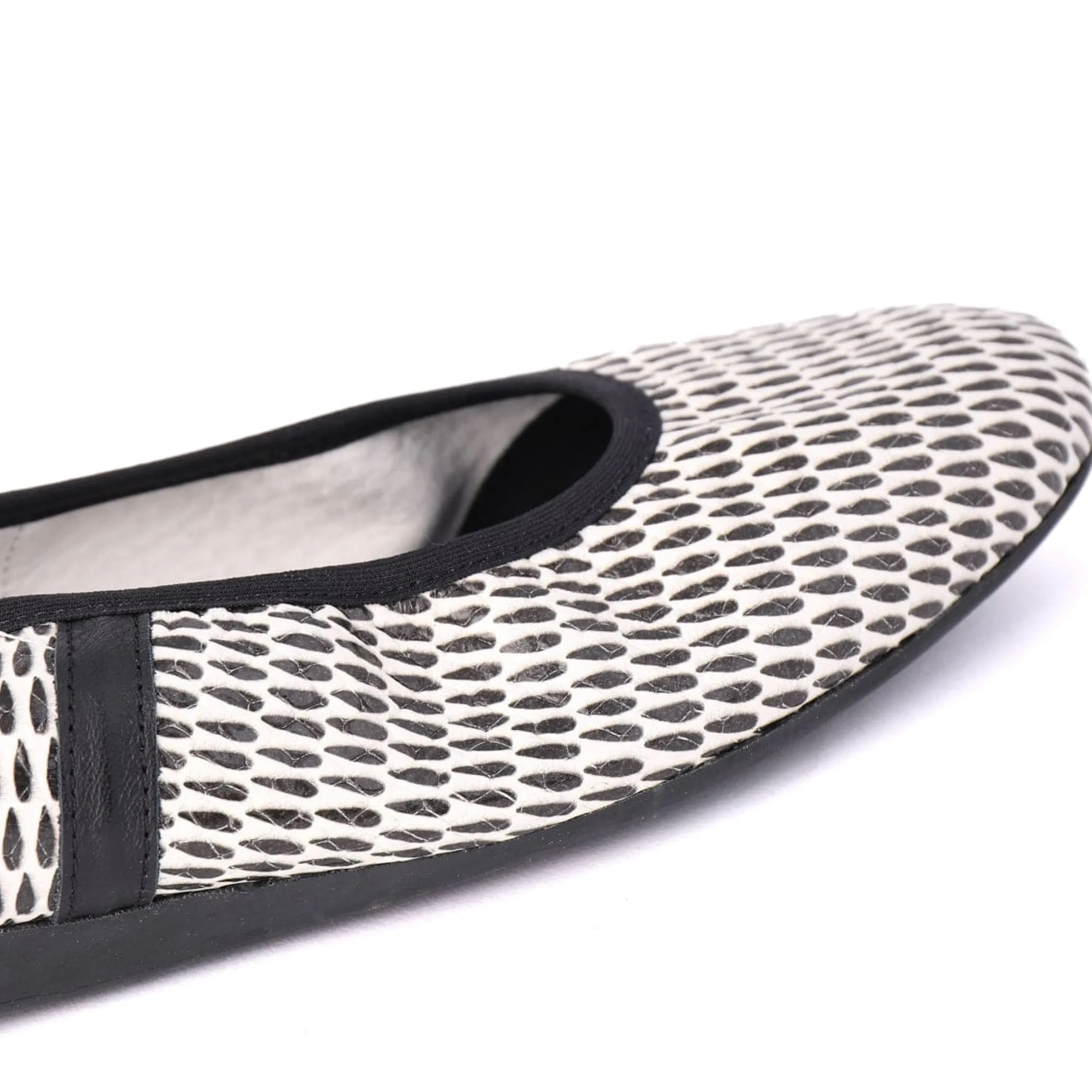 Indulge in modern sophistication with the LAMOUR Black and White. Handcrafted in Europe from the finest printed leather, its intricate upper and sleek leather lining are enveloped in a soft sole, promising a chic ballet style. Discreet refinement for any wardrobe.