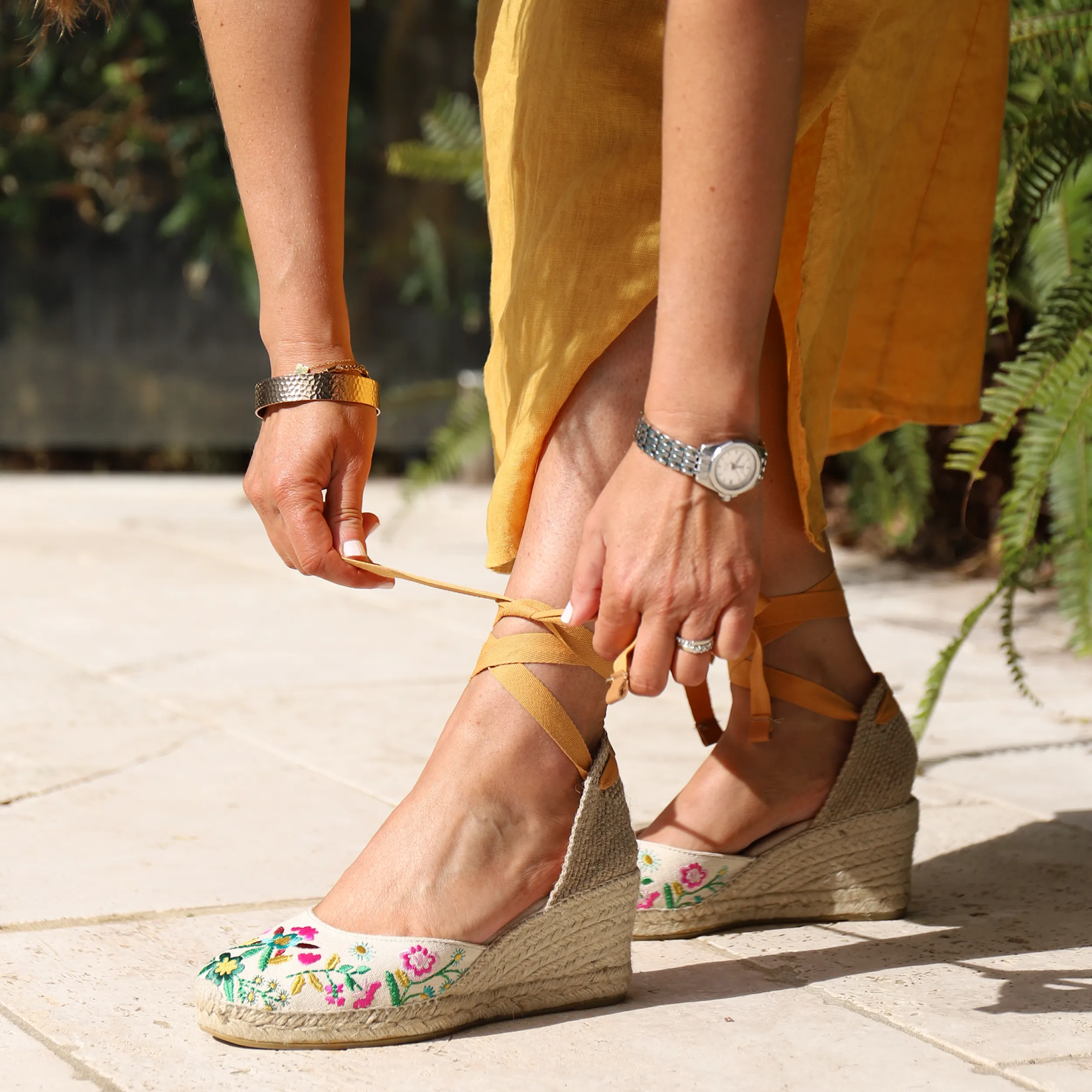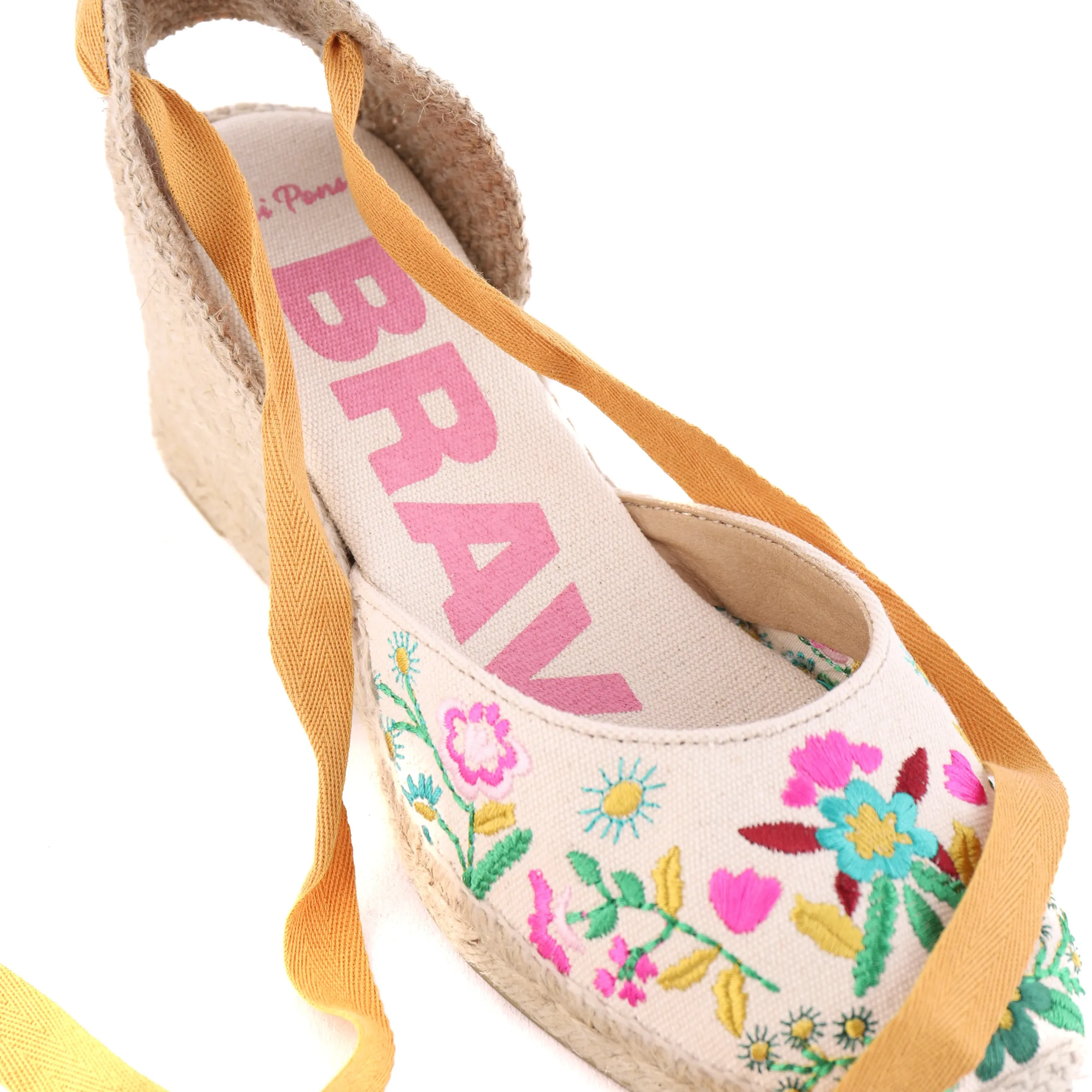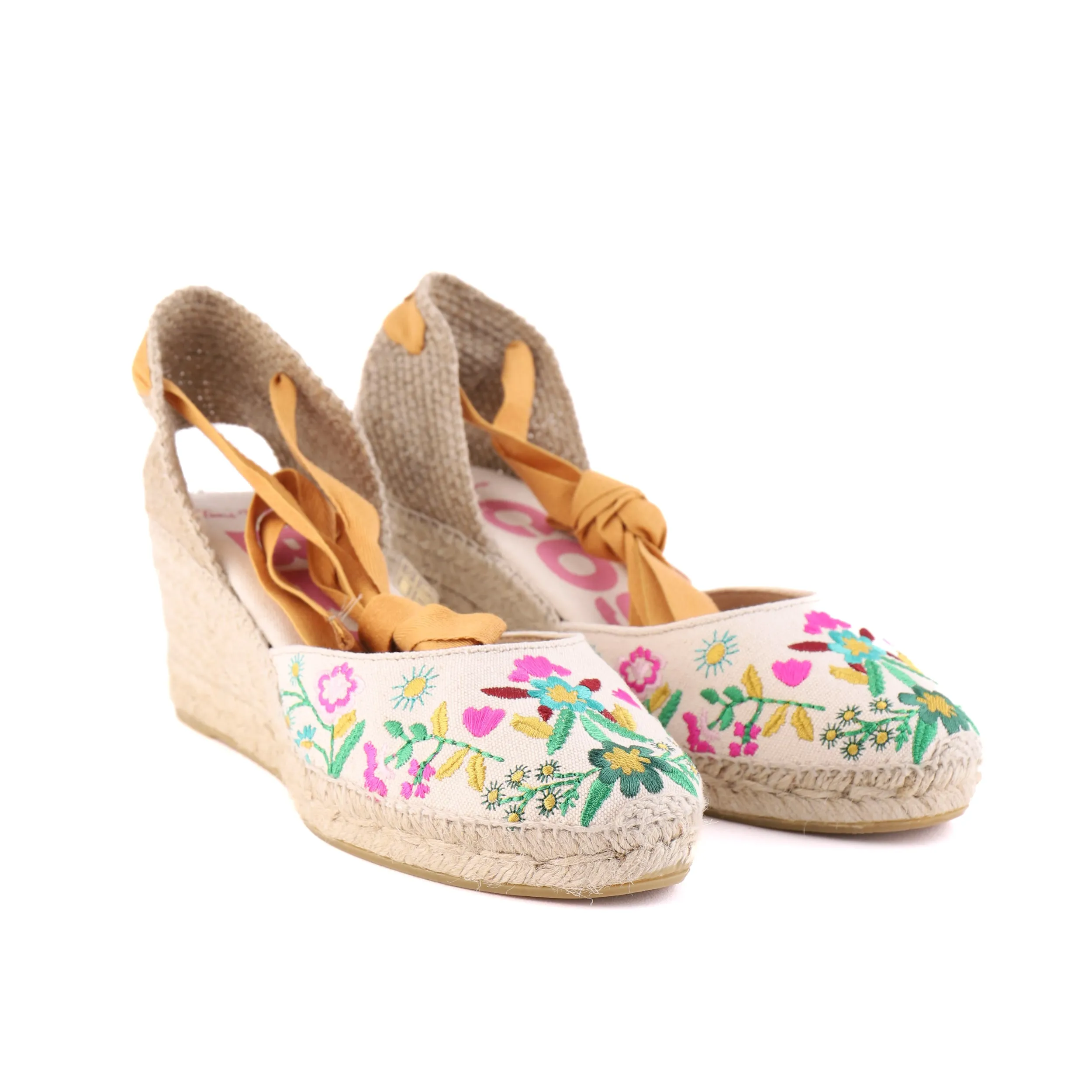 Indulge in luxury with our CASTELL Floral espadrilles. Made in Spain, the canvas embroidered upper and ankle wrap strap add a touch of sophistication. The soft sole and heeled design offer both fashion and comfort. Elevate your style with these premium shoes.
