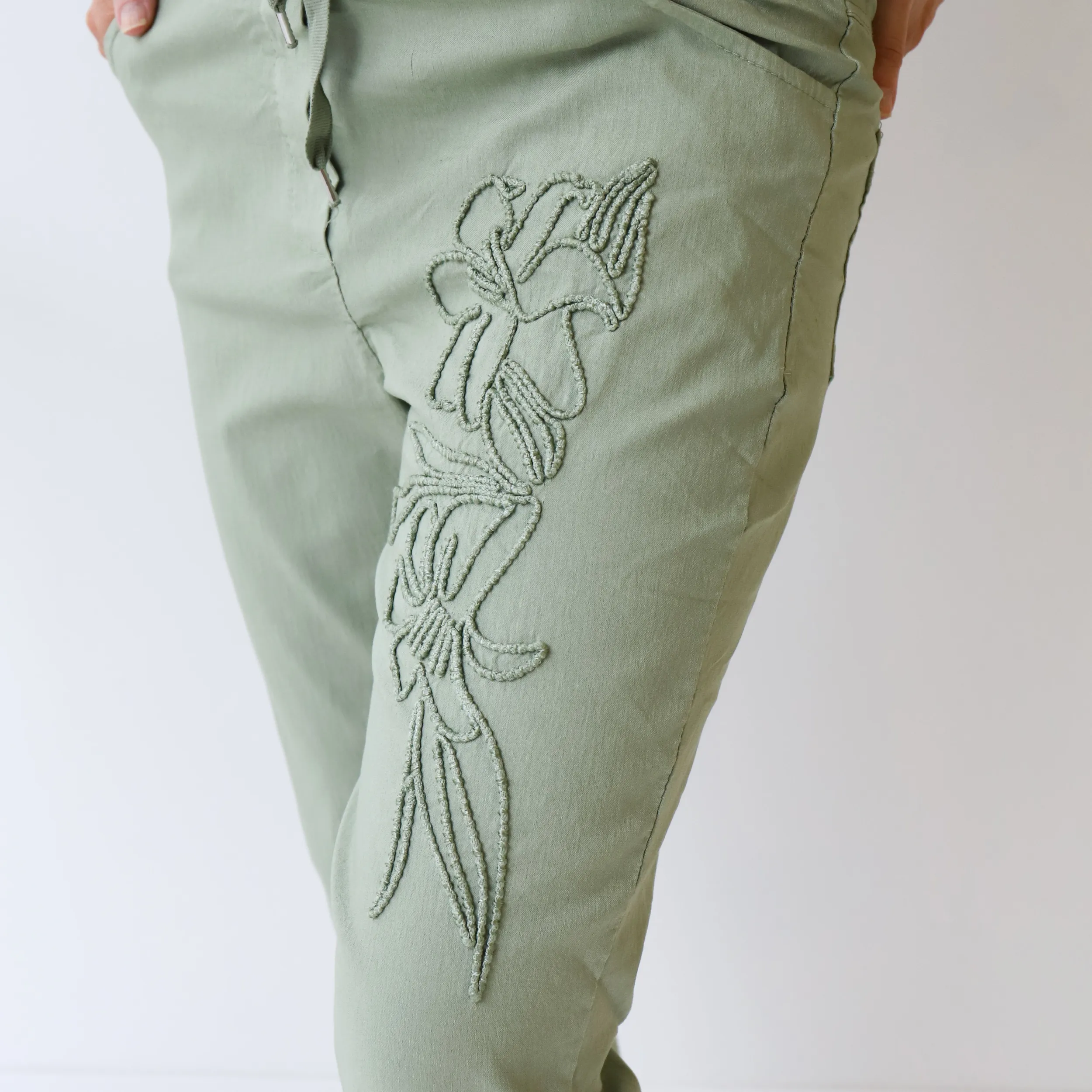 Elevate your wardrobe with FRED Khaki – lightweight pants crafted in Italy. Featuring an embroidered floral design, an adjustable drawstring, and an elasticated waist, these pants offer effortless comfort and sophistication. Luxury at its finest.