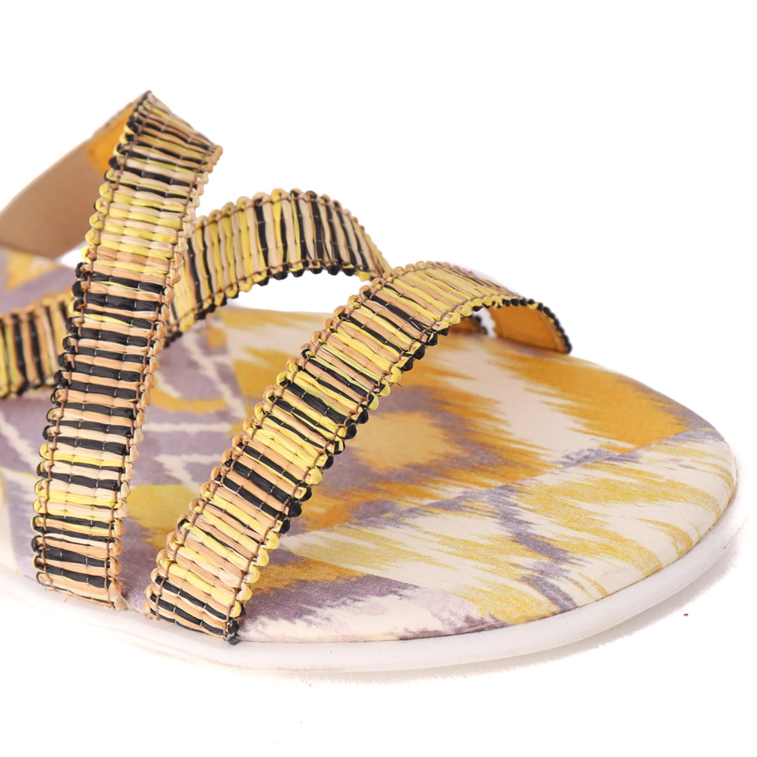 Add some color to your summer wardrobe with our 86552-69 woven strappy slides. These stylish slides feature a vibrant yellow multi-colored detail that will elevate any outfit. With arch support and a moulded foot bed, you can comfortably wear these all day while still looking effortlessly chic.